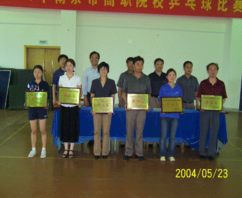 南京市職業(yè)院校乒乓球比賽于2004年5月22日----23日在南京信息職業(yè)技術(shù)學(xué)院舉行。我院乒乓球隊(duì)經(jīng)過一個(gè)月的緊張刻苦訓(xùn)練,比賽中運(yùn)動(dòng)員經(jīng)過頑強(qiáng)拼搏,獲得男子團(tuán)體第一名,女子團(tuán)體第一名,為學(xué)院爭得了榮譽(yù),展現(xiàn)了交元學(xué)子風(fēng)采。參加比賽的運(yùn)動(dòng)員是: