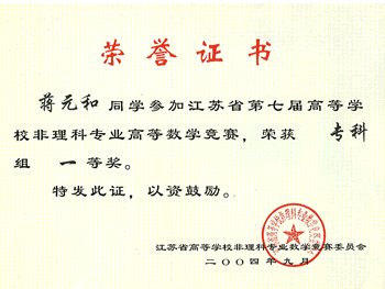 江蘇省第七屆高等學(xué)校非理科專業(yè)高等數(shù)學(xué)競(jìng)賽于2004年6月5日舉行,江蘇省共65所高校3725名學(xué)生參加競(jìng)賽。我院組織了40名學(xué)生參賽,其中獲得??平M一等獎(jiǎng)2名,二等獎(jiǎng)5名,三等獎(jiǎng)16名。