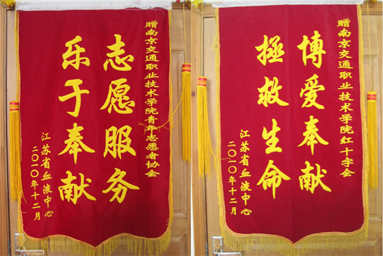1月5日,江蘇省血液中心給學(xué)院送來“博愛奉獻(xiàn) 拯救生命”、“志愿服務(wù) 樂于奉獻(xiàn)”兩面錦旗,對學(xué)院在無償獻(xiàn)血中所做工作表示感謝。2010年,學(xué)院兩次協(xié)助省血液中心組織學(xué)生獻(xiàn)血近2000人次,院紅十字會、青年志愿者協(xié)會會員們默默承擔(dān)了大量工作,有效保障了無償獻(xiàn)血工作的順利進(jìn)行。學(xué)院學(xué)工處王平處長獲“南京市紅十字會系統(tǒng)優(yōu)秀志愿者”稱號