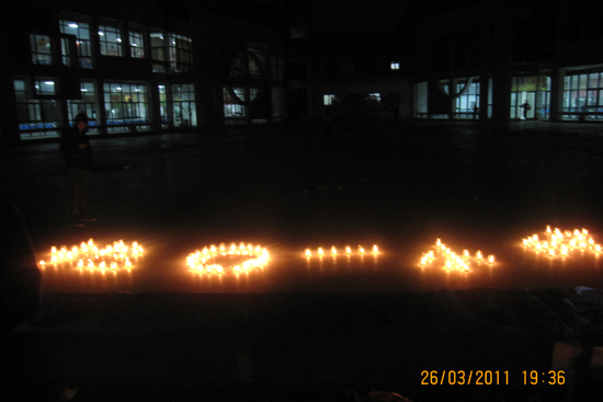 當晚20時30分,學生公寓樓陸續(xù)“黑”了下來。為了在“熄滅”能耗的同時,“點亮”節(jié)能知識,千余名同學參加了學生自管會的志愿者們發(fā)起的低碳環(huán)保承諾簽名和環(huán)保知識有獎猜謎活動,同學們在食堂廣場用蠟燭擺出“地球一小時”的字樣,在黑暗中伴隨燭光,享受快樂。