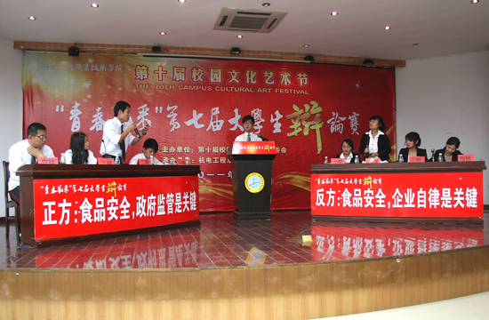 “青春風(fēng)采”第七屆大學(xué)生辯論賽由機(jī)電工程系承辦。當(dāng)晚的決賽在路橋工程系代表隊(duì)和人文藝術(shù)系代表隊(duì)之間展開,雙方就“食品安全:究竟政府監(jiān)管是關(guān)鍵,還是企業(yè)自律是關(guān)鍵”這一當(dāng)前的民生熱點(diǎn)話題展開了激烈的辯論。辯手們思路清晰,言辭犀利,旁征博引,應(yīng)對敏捷,現(xiàn)場觀眾不時發(fā)出熱烈掌聲?,F(xiàn)場互動環(huán)節(jié)中,場下觀眾頻頻提問,場上辯手機(jī)智作答,全員思辨的熱烈場面折射出廣大同學(xué)對生在當(dāng)下的社會的熱情關(guān)切。最終,路橋工程系以出色的發(fā)揮獲得冠軍,人文藝術(shù)系獲得亞軍,第三名由機(jī)電工程系獲得。參加“青春風(fēng)采”第七屆大學(xué)生辯論賽的七支代表隊(duì)歷時三周,經(jīng)歷三輪共七場比賽,圓滿結(jié)束。