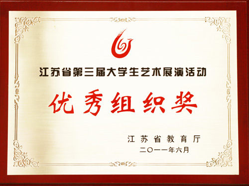 在江蘇省教育廳今年上半年開展的省第三屆大學(xué)生藝術(shù)展演中,學(xué)院喜獲“優(yōu)秀組織獎”。6月28日下午,省教育廳在江蘇省教育電視臺舉行了頒獎大會暨閉幕式文藝演出。