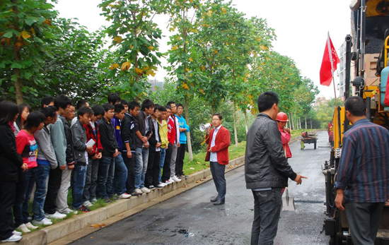 施工隊負責人向同學們現(xiàn)場介紹了校園內(nèi)瀝青路面攤鋪的相關(guān)情況。老師們進行現(xiàn)場教學,對照現(xiàn)場施工組織和機械設(shè)備向?qū)W生詳細介紹了路面攤鋪的施工工藝和碾壓成型的全過程,還將施工的實際情況與書本上的知識進行對比,讓學生加深對知識的理解和消化,真正做到理論聯(lián)系實際。