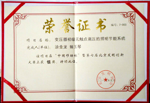 我校機電工程學院涂金龍老師的參賽項目“變壓器初級無觸點調壓的照明節(jié)能系統(tǒng)”獲得發(fā)明創(chuàng)新大賽銀獎。該項目還被選為“中海發(fā)明創(chuàng)業(yè)專項獎”候選項目。經過專場答辯和專家組評審,該項目獲得“中海發(fā)明創(chuàng)業(yè)專項獎”(第1名)。