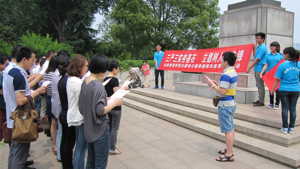 最后,在周恩來總理銅像廣場前,全體黨員一起重溫了入黨誓詞;全體教師集體宣讀了《高等學(xué)校教師職業(yè)道德規(guī)范》,誓以“愛國守法,敬業(yè)愛生,教書育人,嚴(yán)謹(jǐn)治學(xué),服務(wù)社會(huì),為人師表”24個(gè)字的職業(yè)道德規(guī)范為準(zhǔn)繩,做一名好老師。