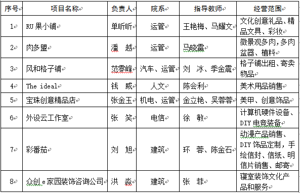 經(jīng)學生團隊申請、招生就業(yè)處初審、學院組織綜合評議,擬定以下8個創(chuàng)業(yè)團隊入駐大學生校內創(chuàng)業(yè)孵化基地,現(xiàn)予以公示: