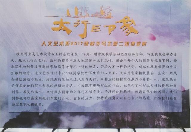 此次展覽主題為太行印象,是該系2017級藝術(shù)專業(yè)115名同學(xué)赴河南太行山區(qū)寫生歸來及二維設(shè)計(jì)基礎(chǔ)課相結(jié)合的創(chuàng)作成果。展覽作品的構(gòu)思均來自于學(xué)生在寫生過程中收集的素材和感受,表現(xiàn)手法既體現(xiàn)了學(xué)生原有的藝術(shù)基礎(chǔ),同時也利用課程項(xiàng)目化教學(xué)充分挖掘發(fā)揮學(xué)生想象力、創(chuàng)造力,從而實(shí)現(xiàn)了展覽整體主題突出,形式豐富,內(nèi)容生動,制作精良的效果。此次展覽同時也反映了藝術(shù)設(shè)計(jì)基礎(chǔ)課程在課程定位上要求學(xué)生由追求純藝術(shù)美向追求設(shè)計(jì)應(yīng)用美轉(zhuǎn)變、追求再現(xiàn)技能向追求表現(xiàn)技能轉(zhuǎn)變、由被動接受向主動創(chuàng)意轉(zhuǎn)變、由常規(guī)思維向發(fā)散思維轉(zhuǎn)變的目標(biāo)。