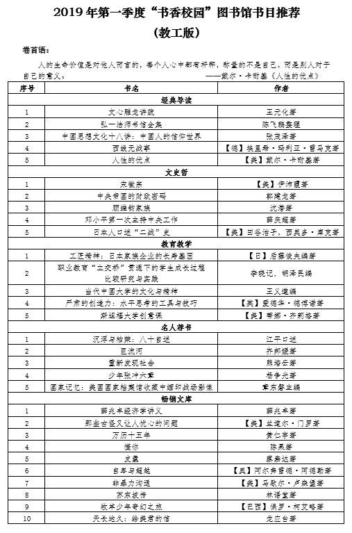 2019年第一季度“書香校園”圖書館書目推薦(教工版)