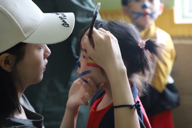 活動(dòng)開(kāi)始前,志愿者協(xié)助幼兒園老師布置活動(dòng)場(chǎng)地,搬運(yùn)節(jié)目道具?,F(xiàn)場(chǎng)布置完成后,志愿者分散到各班,給參加演出的小朋友換上演出服裝,化上漂亮的妝容,小朋友們進(jìn)行了精彩表演?;顒?dòng)結(jié)束后,向日葵幼兒園給志愿者戴上了印有幼兒園標(biāo)志的志愿者袖章。