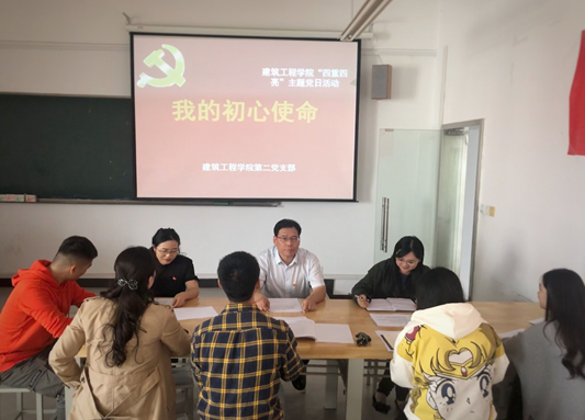 最后,建筑工程學院第二黨支部書記曹瑩組織黨員對照“四講四有”合格黨員標準以及共產(chǎn)黨人的初心使命,談一談作為黨員干部、輔導員、教師,我們?nèi)朦h為什么、成長靠什么、為黨干什么,引導大家重問自己的入黨初心。
