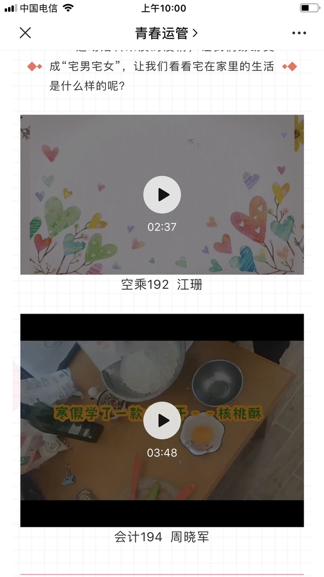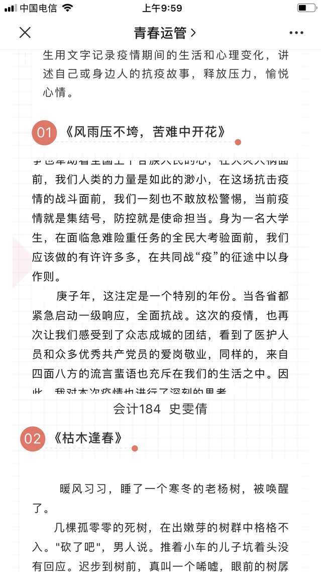 活動期間,學(xué)院共收到200多份文字、視頻類作品,這些作品記錄、分享了同學(xué)們“宅家”學(xué)習(xí)、生活、鍛煉等種種場景以及抗疫期間個人心路歷程,反映同學(xué)們在疫情防控期對生活的熱愛以及面對挫折、逆境的勇氣和信心。