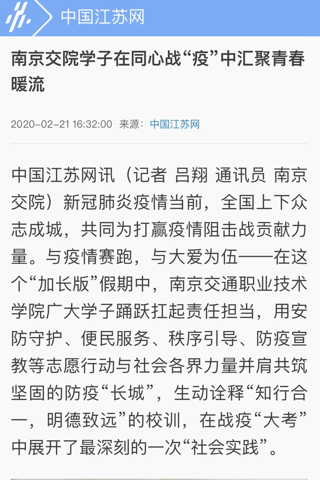 【中國(guó)江蘇網(wǎng)】南京交院學(xué)子在同心戰(zhàn)“疫”中匯聚青春暖流