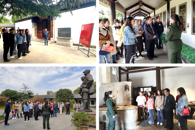 追尋先輩足跡。“功勛著中華,風(fēng)骨炳千秋。這里通過111幅將軍書法作品,展示了無產(chǎn)階級(jí)革命家、軍事家、外交家,黨和國(guó)家卓越的領(lǐng)導(dǎo)人陳毅同志堅(jiān)定的革命信念、崇高的道德風(fēng)范和詩人的豪邁情懷……”隨著講解員的朗朗介紹,全體黨員同志和教師們駐足在幽靜曲折的碑廊里,凝神靜聽。1939年秋,新四軍江南指揮部在溧陽水西村宣布成立,奠定了華中抗日根據(jù)地的基礎(chǔ),在我黨黨史、我軍軍史上譜寫了輝煌的篇章。這所新四軍江南指揮部紀(jì)念館,承載著那段烽火歲月的難忘記憶,展現(xiàn)了革命先輩拋灑熱血的忘我奉獻(xiàn),也見證了社會(huì)主義新時(shí)代交通事業(yè)建設(shè)者們追尋先輩初心、勇?lián)鷷r(shí)代使命的堅(jiān)定與執(zhí)著。懷著崇敬的心情,大家在講解員的引領(lǐng)下依次參觀了新四軍江南指揮部司令部舊址、陳毅元帥詩詞將軍書法碑廊、毛澤東像章陳列館等,現(xiàn)場(chǎng)感受了“理想信念堅(jiān)定、人民利益至上、不畏艱難困苦、樂于奉獻(xiàn)犧牲”的水西精神。在新四軍江南指揮部舊址前,基礎(chǔ)教學(xué)部直屬黨支部全體黨員莊嚴(yán)地舉起右拳,重溫了入黨誓詞,進(jìn)一步堅(jiān)定了理想與信念,展示了對(duì)黨忠誠(chéng)、積極工作,爭(zhēng)做合格黨員的信心與決心。