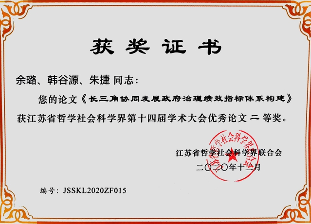 馬克思主義學(xué)院余璐老師的論文《長三角一體化發(fā)展政府治理績效指標(biāo)體系構(gòu)建》在本次大會中榮獲二等獎,并在政治學(xué)專場作了發(fā)言。