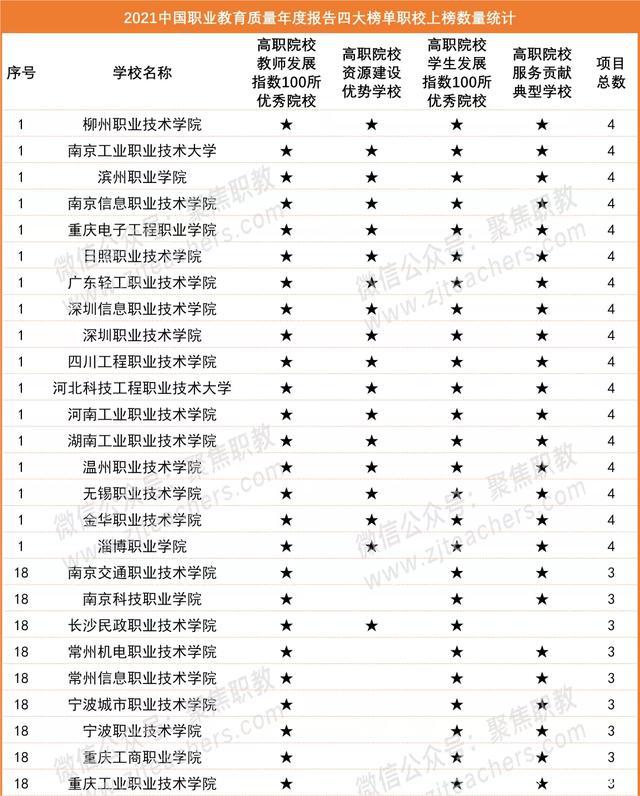 學(xué)院同時(shí)入選高職院校教師發(fā)展指數(shù)100所優(yōu)秀院校、高職院校學(xué)生發(fā)展指數(shù)100所優(yōu)秀院校、高職院校服務(wù)貢獻(xiàn)典型學(xué)校三個(gè)榜單。據(jù)統(tǒng)計(jì),全國有17所高職院校榮登四個(gè)榜單,39所高職院校榮登上三個(gè)榜單。
