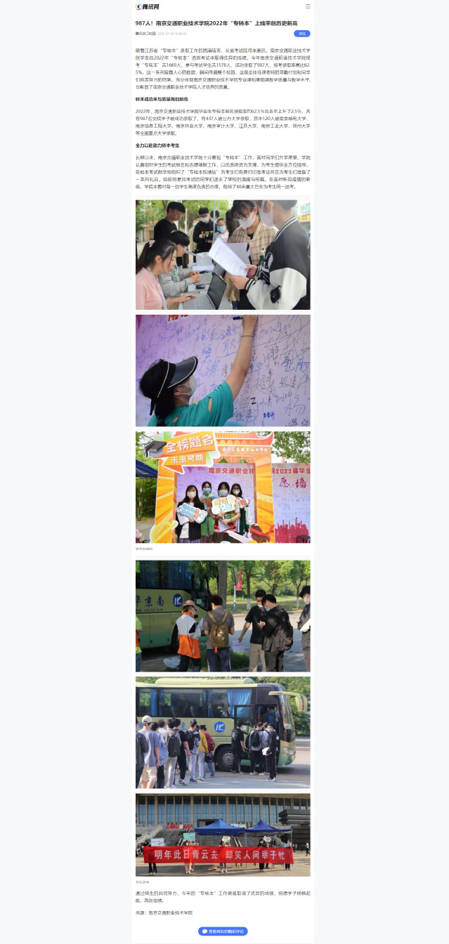 【騰訊網(wǎng)】987人!南京交通職業(yè)技術(shù)學(xué)院2022年“專轉(zhuǎn)本”上線率創(chuàng)歷史新高