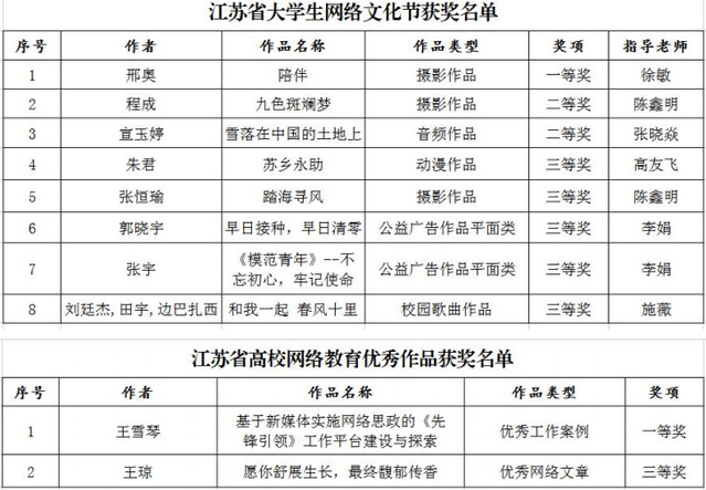 近日,江蘇省委教育工委、省教育廳公布第二屆江蘇省大學(xué)生網(wǎng)絡(luò)文化節(jié)和高校網(wǎng)絡(luò)教育優(yōu)秀作品推選展示活動遴選結(jié)果,學(xué)院榮獲大學(xué)生網(wǎng)絡(luò)文化節(jié)作品一等獎1項,二等獎2項,三等獎5項;高校網(wǎng)絡(luò)教育優(yōu)秀作品一等獎1項,三等獎1項。