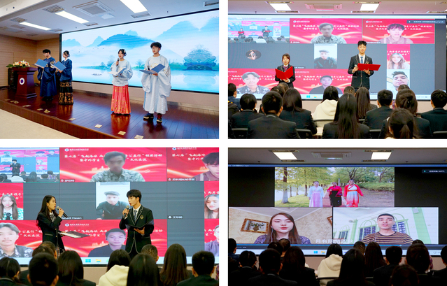 在中外學生“共讀一本書”活動中,來自印尼、老撾、孟加拉的留學生和絲路學院學員代表以及廣播站、國學社學生隔屏演繹了《沁園春·雪》《熱愛生命》等5首經典詩詞的誦讀,獲得了現場師生熱烈反響。