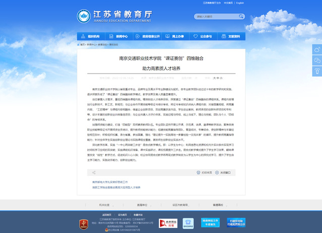 【江蘇省教育廳官網(wǎng)】南京交通職業(yè)技術(shù)學(xué)院“課證賽創(chuàng)”四維融合 助力高素質(zhì)人才培養(yǎng)