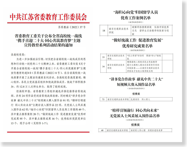 學(xué)院基礎(chǔ)教學(xué)部直屬黨支部報(bào)送的《破解網(wǎng)絡(luò)授課困境弘揚(yáng)中國(guó)優(yōu)秀文化 留學(xué)生漢語(yǔ)教學(xué)的探索與創(chuàng)新》獲“海歸心向黨”歸國(guó)留學(xué)人員優(yōu)秀工作案例;運(yùn)輸管理學(xué)院黨總支報(bào)送的《“黨工學(xué)團(tuán)”四協(xié)同 聚攏“四心”助統(tǒng)戰(zhàn)》和電子信息工程學(xué)院黨總支報(bào)送的《增強(qiáng)高校二級(jí)院系民主黨派教師履行立德樹(shù)人根本任務(wù)職責(zé)作用的實(shí)踐探索——以南京交通職業(yè)技術(shù)學(xué)院電子信息工程學(xué)院為例》均獲“做好統(tǒng)戰(zhàn)工作 促進(jìn)教育發(fā)展” 優(yōu)秀研究成果;機(jī)關(guān)二黨總支報(bào)送的《扎根崗位 同心育人》獲得“講多黨合作故事 獻(xiàn)禮中共二十大”短視頻大賽優(yōu)秀獎(jiǎng);建筑工程學(xué)院黨總支報(bào)送的《畫(huà)好育人同心圓 共筑非遺傳承夢(mèng)》獲“榜樣引領(lǐng)前行 同心共向未來(lái)”無(wú)黨派人士風(fēng)采展優(yōu)秀獎(jiǎng)。