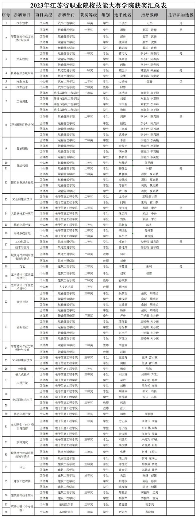 日前,2023年江蘇省職業(yè)院校技能大賽落下帷幕,學院共有117名選手(含教師17名)參加了36個賽項的競賽,共斬獲39枚獎牌,其中一等獎4枚、二等獎18枚、三等獎17枚,其中有10支代表隊獲得國賽選拔賽資格。學院2023年省職業(yè)技能大賽獲獎數(shù)量與質(zhì)量較2022年有大幅度提升,在全省高職院校中處于領(lǐng)先地位。具體獲獎情況如下: