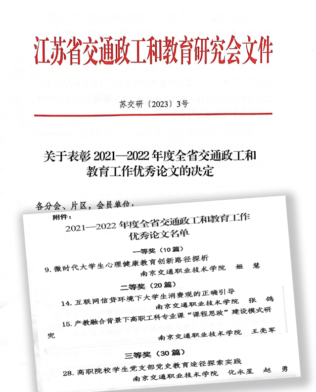 江蘇省交通政工和教育研究會(huì)近日公布了《關(guān)于表彰2021—2022年度全省交通政工和教育工作優(yōu)秀論文的決定》(蘇交研【2023】3號(hào)),學(xué)院教師參評(píng)論文獲一等獎(jiǎng)1個(gè)、二等獎(jiǎng)2個(gè)、三等獎(jiǎng)1個(gè),其中,《微時(shí)代大學(xué)生心理健康教育創(chuàng)新路徑探析》(姬慧)獲一等獎(jiǎng),《互聯(lián)網(wǎng)信貸環(huán)境下大學(xué)生消費(fèi)觀的正確引導(dǎo)》(張鸰)、《產(chǎn)教融合背景下高職工科專業(yè)課“課程思政”建設(shè)模式研究》(王亮軍)獲二等獎(jiǎng),《高職院校學(xué)生黨支部黨史教育途徑探索實(shí)踐》(化永星 趙勇)獲三等獎(jiǎng)。