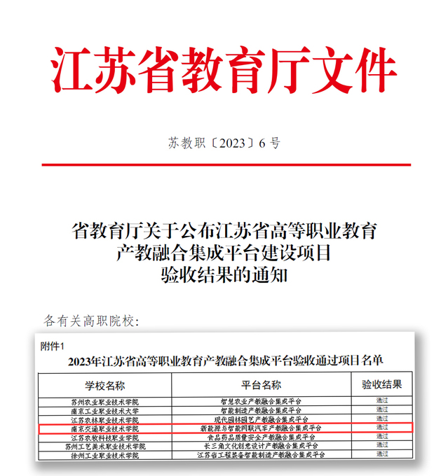 近日,江蘇省教育廳公布了省高等職業(yè)教育產(chǎn)教融合集成平臺(tái)建設(shè)項(xiàng)目驗(yàn)收結(jié)果(蘇教職〔2023〕6 號(hào)),南京交通職業(yè)技術(shù)學(xué)院“新能源與智能網(wǎng)聯(lián)汽車產(chǎn)教融合集成平臺(tái)”順利通過驗(yàn)收。