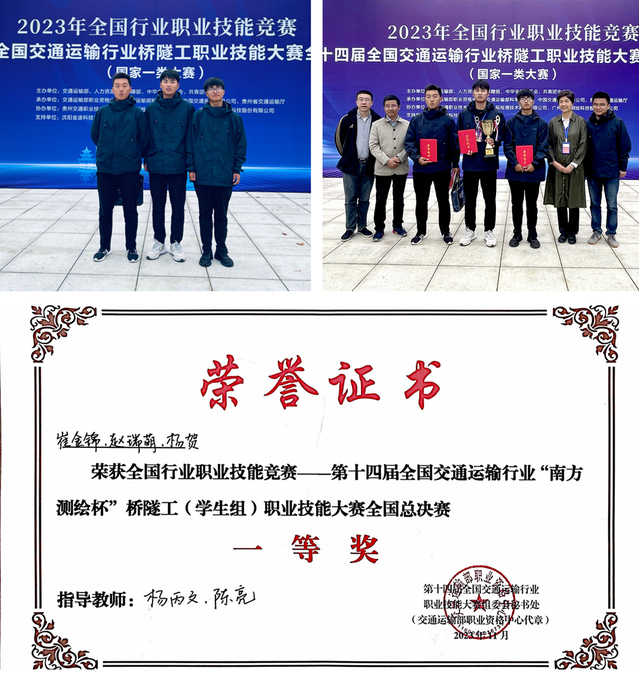 10月29日—11月4日,由交通運(yùn)輸部、人社部、中華總工會(huì)、共青團(tuán)中央等四部委聯(lián)合主辦的全國(guó)一類大賽——第十四屆全國(guó)交通運(yùn)輸行業(yè)“升拓杯”橋隧工(職工組)、“南方測(cè)繪杯”橋隧工(學(xué)生組)職業(yè)技能大賽全國(guó)總決賽在貴州交通職業(yè)技術(shù)學(xué)院舉行。經(jīng)過(guò)激烈角逐,路橋與港航工程學(xué)院楊賀、崔金錦、趙瑞萌三位同學(xué),在楊丙文和陳亮老師指導(dǎo)下,憑借出色的創(chuàng)新思維和扎實(shí)的技能功底,成功獲得學(xué)生組團(tuán)體一等獎(jiǎng)的好成績(jī)。