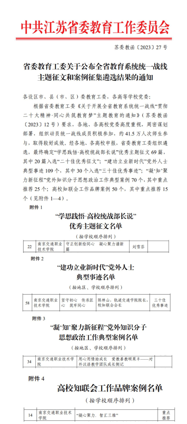 學(xué)院黨委統(tǒng)戰(zhàn)部報(bào)送的《守正創(chuàng)新繪同心 凝心聚力譜新篇》獲“學(xué)思踐悟·高校統(tǒng)戰(zhàn)部長(zhǎng)說”優(yōu)秀主題征文;軌道交通學(xué)院黨總支報(bào)送的《堅(jiān)守初心 傳承匠心 筑牢同心》獲“建功立業(yè)新時(shí)代”黨外人士典型事跡,并入選“三十佳優(yōu)秀事跡”;基礎(chǔ)教學(xué)部直屬黨支部報(bào)送的《用心用情助成長(zhǎng) 愛教善教碩果豐——對(duì)外漢語(yǔ)教學(xué)團(tuán)隊(duì)成長(zhǎng)側(cè)記》獲“凝‘知’聚力新征程”黨外知識(shí)分子思想政治工作典型案例;學(xué)院知聯(lián)會(huì)報(bào)送的《“凝心聚力﹒智匯三維”》獲高校知聯(lián)會(huì)工作品牌案例,并入選“重點(diǎn)推薦”。