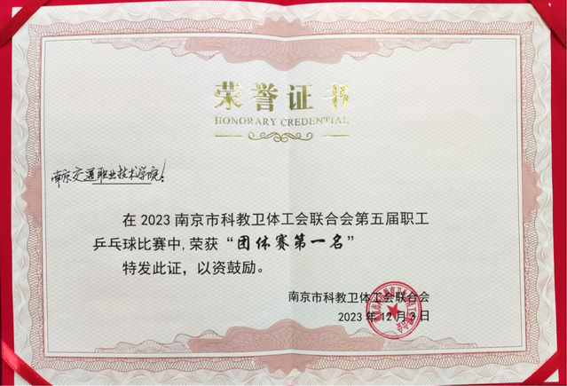 12月2日、3日,2023年南京市科教衛(wèi)體工會(huì)聯(lián)合會(huì)第五屆職工乒乓球比賽在學(xué)院舉行,來(lái)自全系統(tǒng)90多家單位的38支隊(duì)伍同臺(tái)競(jìng)技。由翟鵬鵬、朱蘭君、王道峰、張銳、王雪琴、蔣浩豐等6位職工組成的混合團(tuán)體隊(duì),團(tuán)結(jié)一心,奮力拚搏,以七戰(zhàn)七勝的戰(zhàn)績(jī)榮獲“團(tuán)體賽第一名”。