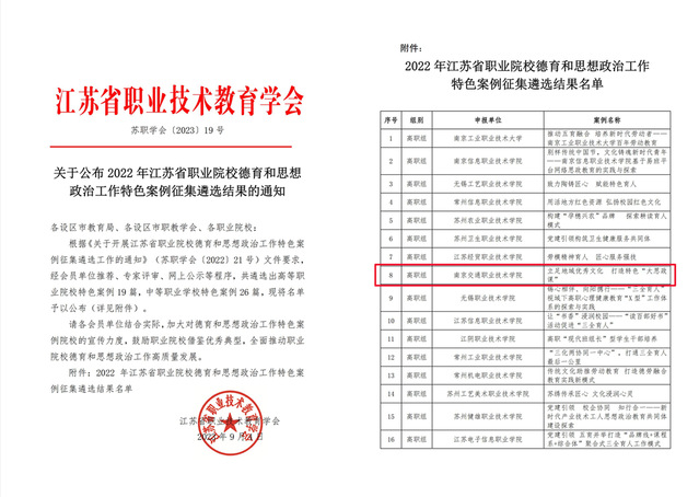 近日,江蘇省職業(yè)技術(shù)教育學會公布了 2022 年江蘇省職業(yè)院校德育和思想政治工作特色案例遴選結(jié)果,根據(jù)《關(guān)于開展江蘇省職業(yè)院校德育和思想政治工作特色案例征集遴選工作的通知》(蘇職學會〔2022〕21 號)文件要求,經(jīng)會員單位推薦、專家評審、網(wǎng)上公示等程序,共遴選出高等職業(yè)院校特色案例 19 篇,馬克思主義學院和黨委宣傳部聯(lián)袂提交的以《立足地域優(yōu)秀文化打造特色“大思政課”》為題的思想政治工作案例獲選特色案例。