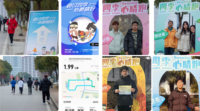 參加四季心晴跑運(yùn)動(dòng)打卡的學(xué)生連續(xù)四天從K棟宿舍的一站式綜合服務(wù)大廳出發(fā),用有關(guān)運(yùn)動(dòng)的軟件記錄心晴跑的軌跡,并在當(dāng)天指定的地點(diǎn),打卡拍攝呈現(xiàn)四季主題特色的照片或視頻。正值新的一年即將到來之際,同學(xué)們?cè)诒寂苤嗅尫艍毫?,在回顧四季變遷中體會(huì)成長,在完成打卡任務(wù)中感受陪伴和運(yùn)動(dòng)的快樂。