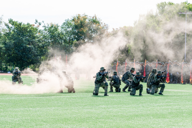 匯報(bào)表演環(huán)節(jié),戰(zhàn)場綜合演練、男生刺殺操、女生匕首操、教官軍體拳等方陣依次亮相,他們氣貫長虹、剛勁有力,緊貼實(shí)戰(zhàn)、精準(zhǔn)出擊,很好地詮釋了交院學(xué)子果敢堅(jiān)毅的戰(zhàn)斗信念,綻放出“硬核”“超燃”的青春風(fēng)采。尤其是在組字環(huán)節(jié)中千名交院學(xué)子擺出“請黨放心、強(qiáng)國有我”“I?交院”等字樣花式表白母校,表白祖國,向祖國75周年華誕獻(xiàn)禮,引爆全場、好評如潮。