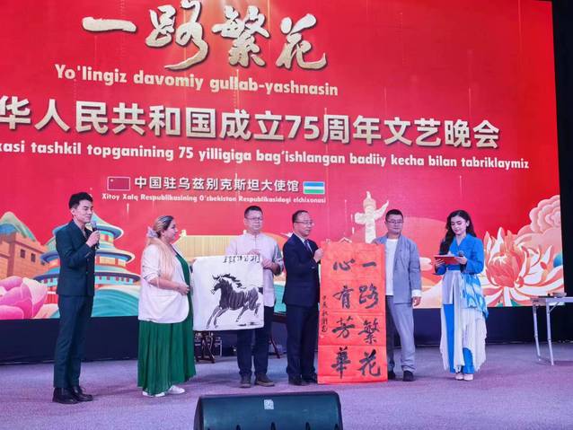 整場(chǎng)晚會(huì)不僅是對(duì)祖國(guó)華誕的熱烈慶祝,更是對(duì)家國(guó)情懷的深情表達(dá)。三位老師不辭辛苦,萬(wàn)里奔波,反復(fù)排練,帶著對(duì)祖國(guó)的深厚感情和為中烏友誼添磚加瓦的良好祝愿,用畫(huà)筆、琴聲盡情抒發(fā)熾熱情感。兩位老師的現(xiàn)場(chǎng)藝術(shù)作品打動(dòng)了現(xiàn)場(chǎng)觀眾,作品被塔什干孔子學(xué)院收藏。三位老師的音書(shū)畫(huà)現(xiàn)場(chǎng)創(chuàng)作既是一次國(guó)際文化交流,也展示了中國(guó)的傳統(tǒng)文化魅力。
