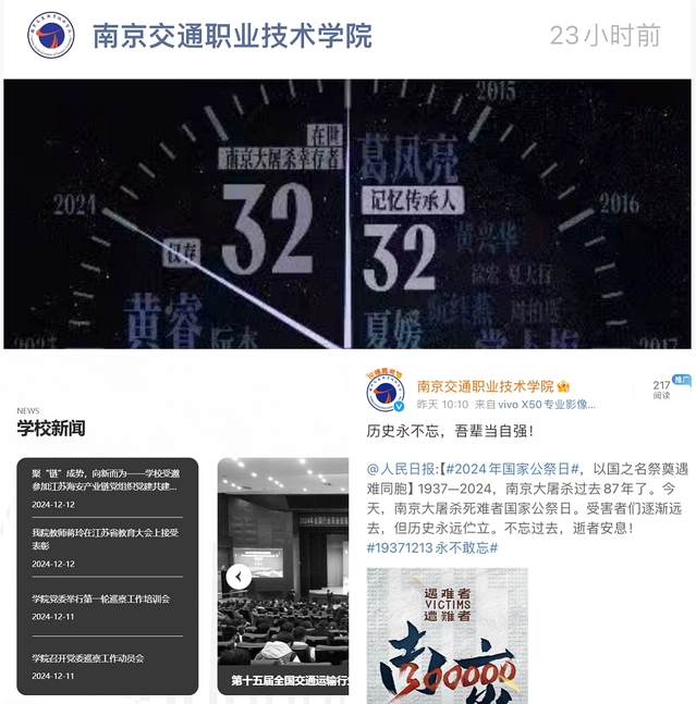 氛圍營造,緬懷先烈。12月13日當(dāng)天,學(xué)院校園網(wǎng)站首頁調(diào)成灰色調(diào),以此祭奠先烈,告慰英魂;充分利用微信微博平臺(tái)、校園廣播等多媒體宣傳陣地,有針對(duì)性地開展愛國主義教育宣傳工作,營造“銘記歷史、緬懷先烈”的濃厚氛圍,引導(dǎo)廣大師生牢固樹立憂患意識(shí),以永不懈怠、一往無前的奮斗姿態(tài)展現(xiàn)新時(shí)代交院青年的愛國情懷。