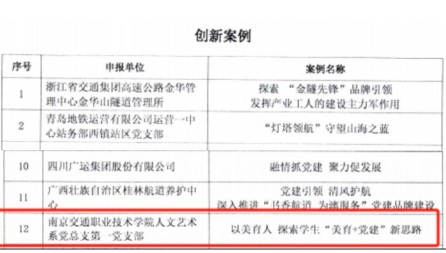 近日,第三屆全國交通運輸行業(yè)基層黨建創(chuàng)新案例暨優(yōu)秀黨建品牌評選結果公布,人文藝術系黨總支第一黨支部申報的《以美育人探索“美育+黨建”新思路》黨建案例成功入選第三屆全國交通運輸行業(yè)基層黨建創(chuàng)新案例。