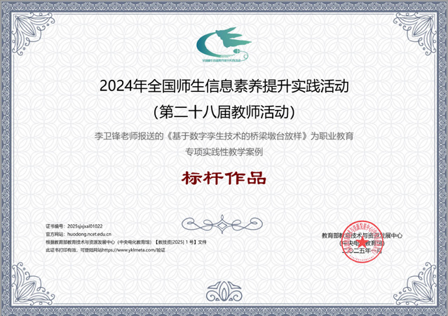 近日,教育部教育資源與發(fā)展中心公布了2024年全國師生信息素養(yǎng)提升實踐活動的作品評定結(jié)果,我院路橋與港航工程學(xué)院李衛(wèi)鋒老師提交的《基于數(shù)字孿生技術(shù)的橋梁墩臺放樣》實踐性教學(xué)案例獲得“標(biāo)桿作品”榮譽。