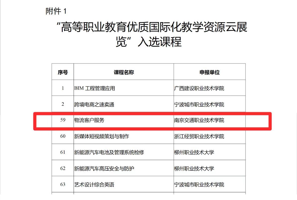 學(xué)校推薦的《物流客戶服務(wù)》課程入選“高等職業(yè)教育優(yōu)質(zhì)國際化教學(xué)資源云展覽”課程,并于2025年3月1-31日在“國家職業(yè)教育智慧教育平臺”國際頻道面向全球展覽。