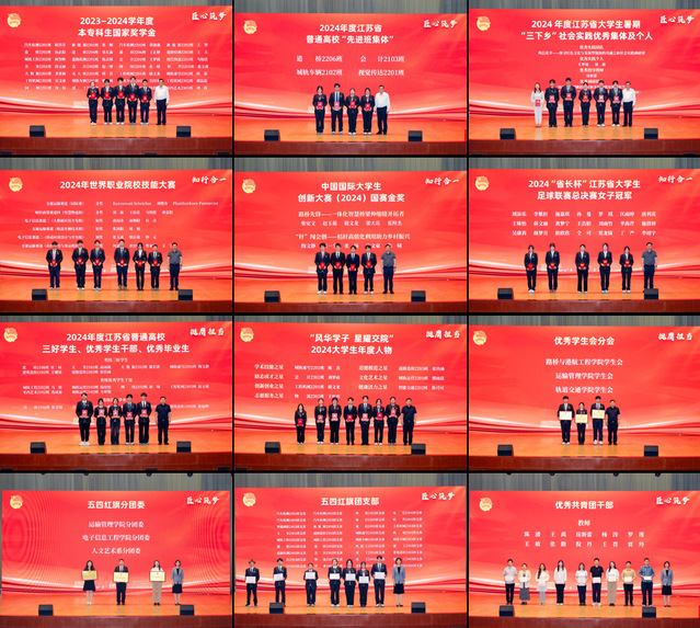 在五四表彰環(huán)節(jié),大會以“匠心筑夢”“知行合一”“挺膺擔(dān)當(dāng)”三個篇章展開,對過去一年在思想引領(lǐng)、技能競賽、社會實踐等領(lǐng)域表現(xiàn)突出的集體和個人進(jìn)行表彰。黨委書記張毅、院長王道峰等領(lǐng)導(dǎo)為獲獎代表頒獎?!拔逅募t旗分團委”“江蘇省先進(jìn)班集體”“國家獎學(xué)金”等集體與個人榮譽表彰,彰顯組織建設(shè)與學(xué)業(yè)標(biāo)桿力量;全國交通運輸行業(yè)技能大賽、中國國際大學(xué)生創(chuàng)新大賽、世界職業(yè)院校技能大賽等賽事獲獎代表上臺領(lǐng)獎,詮釋“技能成才、強國有我”的青春誓言;“十佳共青團員”“十佳青年志愿者”“2024大學(xué)生年度人物”等榮譽獲得者,以行動踐行責(zé)任擔(dān)當(dāng),傳遞向善力量。