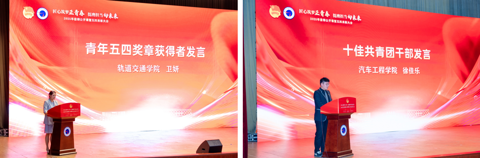 “十佳共青團干部”徐佳樂同學(xué)、“青年五四獎?wù)隆鲍@得者衛(wèi)妍老師分別作為獲獎代表發(fā)言,分享了立足專業(yè)、勇?lián)姑那啻汗适隆?/p>