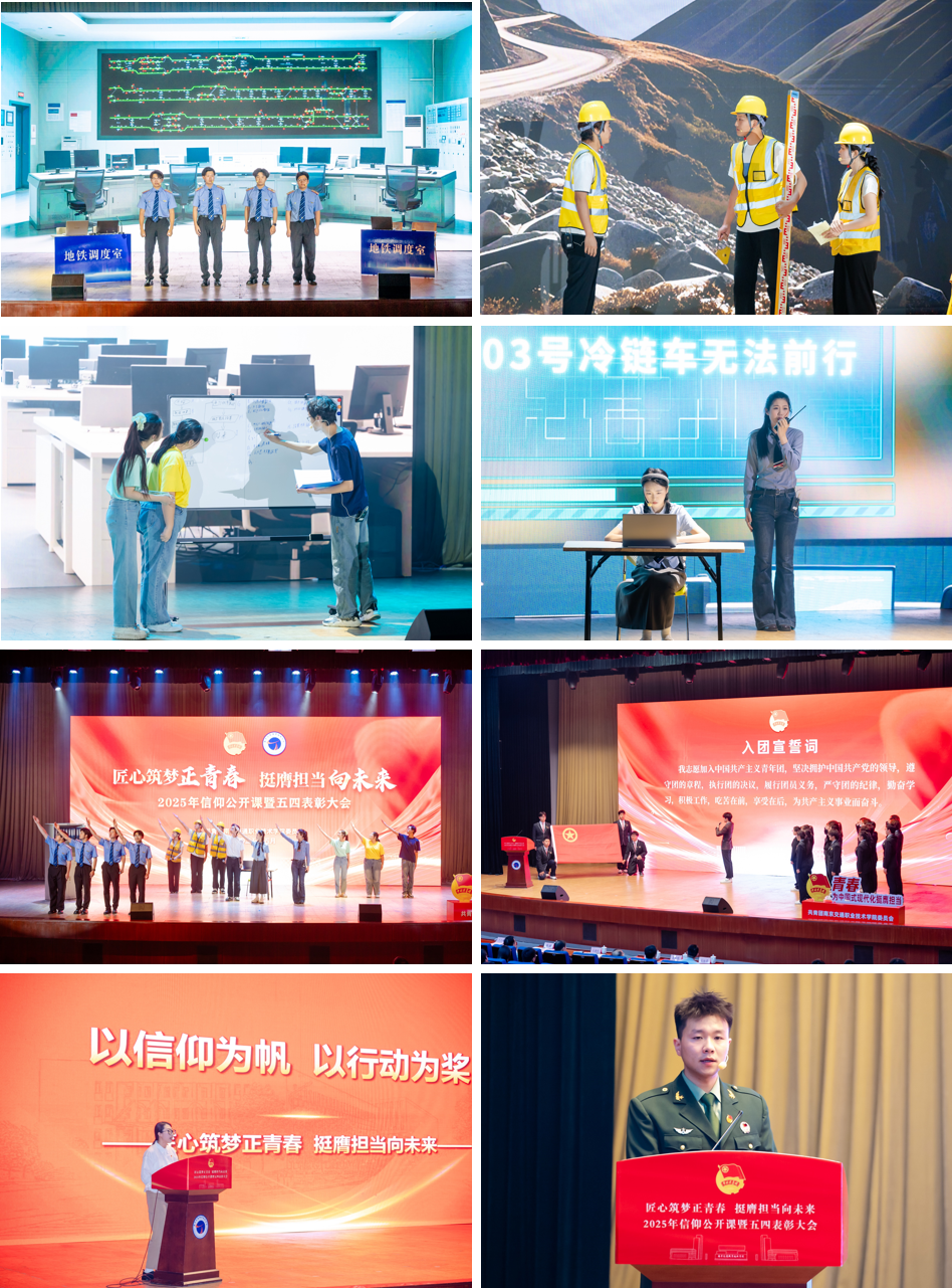 活動現(xiàn)場,思政舞臺劇《青春軌跡》以生動的演繹展現(xiàn)了交院青年用工匠精神雕琢?xí)r代豐碑、用專業(yè)信仰服務(wù)社會的奮斗故事。運輸管理學(xué)院劉宇老師以《以信仰為帆 以行動為槳》為題,號召青年學(xué)子將職業(yè)理想融入國家發(fā)展;電子信息工程學(xué)院朱明輝同學(xué)通過強軍興軍的鮮活事例,詮釋新時代青年的使命擔(dān)當(dāng)。隨后,新團員面向團旗莊嚴(yán)宣誓,為共青團注入新鮮血液。