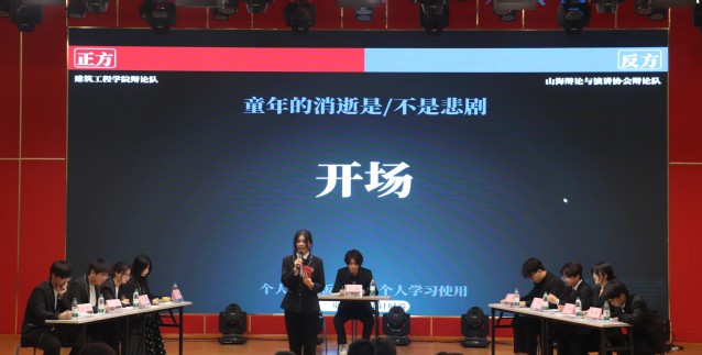 本次決賽的辯題為“童年的消逝是不是悲劇”。由正方建筑工程學(xué)院辯論隊(duì)和反方山海辯論協(xié)會(huì)展開(kāi)辯論,比賽戰(zhàn)況激烈,同學(xué)們互不相讓?zhuān)^點(diǎn)明晰,針?shù)h相對(duì),賽況十分焦灼。正方的辯手從“童年受社會(huì)影響”一詞入手,闡述了“童年的成長(zhǎng)受社會(huì)消極環(huán)境影響”這一觀點(diǎn),通過(guò)引用具體事例以及嚴(yán)謹(jǐn)?shù)倪壿嬐评恚敿?xì)闡述了悲劇產(chǎn)生的根源在于消逝與失去之間的理解偏差,而這一偏差是不可逆轉(zhuǎn)的悲劇。并且他們進(jìn)一步指出在媒體環(huán)境的視角下,童年的消逝無(wú)疑是悲劇。這種對(duì)己方觀點(diǎn)進(jìn)行的拓展與延伸有力地突顯了其觀點(diǎn)的合理性。