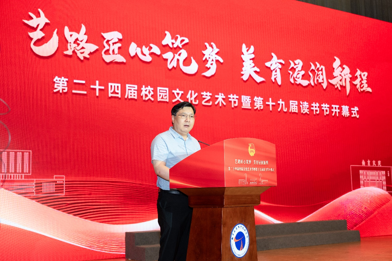王道峰院長發(fā)表了熱情洋溢的開幕致辭,他強(qiáng)調(diào),文化鑄就校園底蘊(yùn),藝術(shù)涵養(yǎng)治學(xué)精神,校園要有文化,才會(huì)有文明的底蘊(yùn);校園更要有藝術(shù),才會(huì)有精神的靈動(dòng)。校園文化藝術(shù)節(jié)和讀書節(jié)不僅是展示才華的舞臺(tái),更是深化文化育人的重要平臺(tái),是學(xué)校落實(shí)立德樹人根本任務(wù)、踐行“五育并舉”教育方針的生動(dòng)實(shí)踐。王院長寄語全院師生:一是要以藝術(shù)為筆,繪就匠心底色,在藝術(shù)實(shí)踐中錘煉專注與創(chuàng)新的工匠精神;二是要以閱讀為帆,駛向智慧深海,讓書香成為校園最美的底色;三是要以行動(dòng)為炬,照亮?xí)r代征程,在實(shí)現(xiàn)中華民族偉大復(fù)興的征程中貢獻(xiàn)青春力量。
