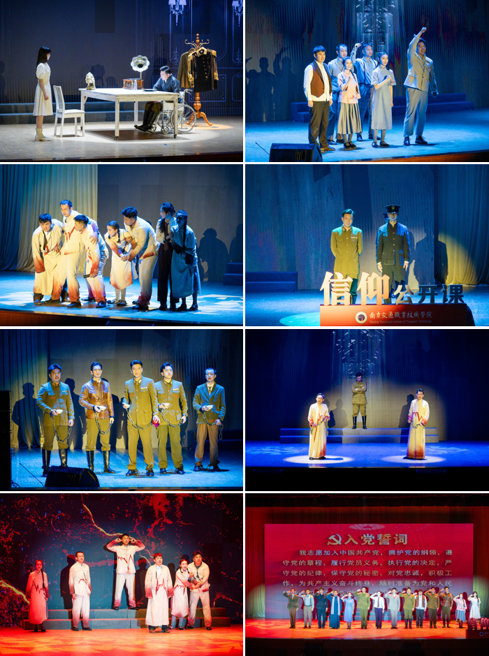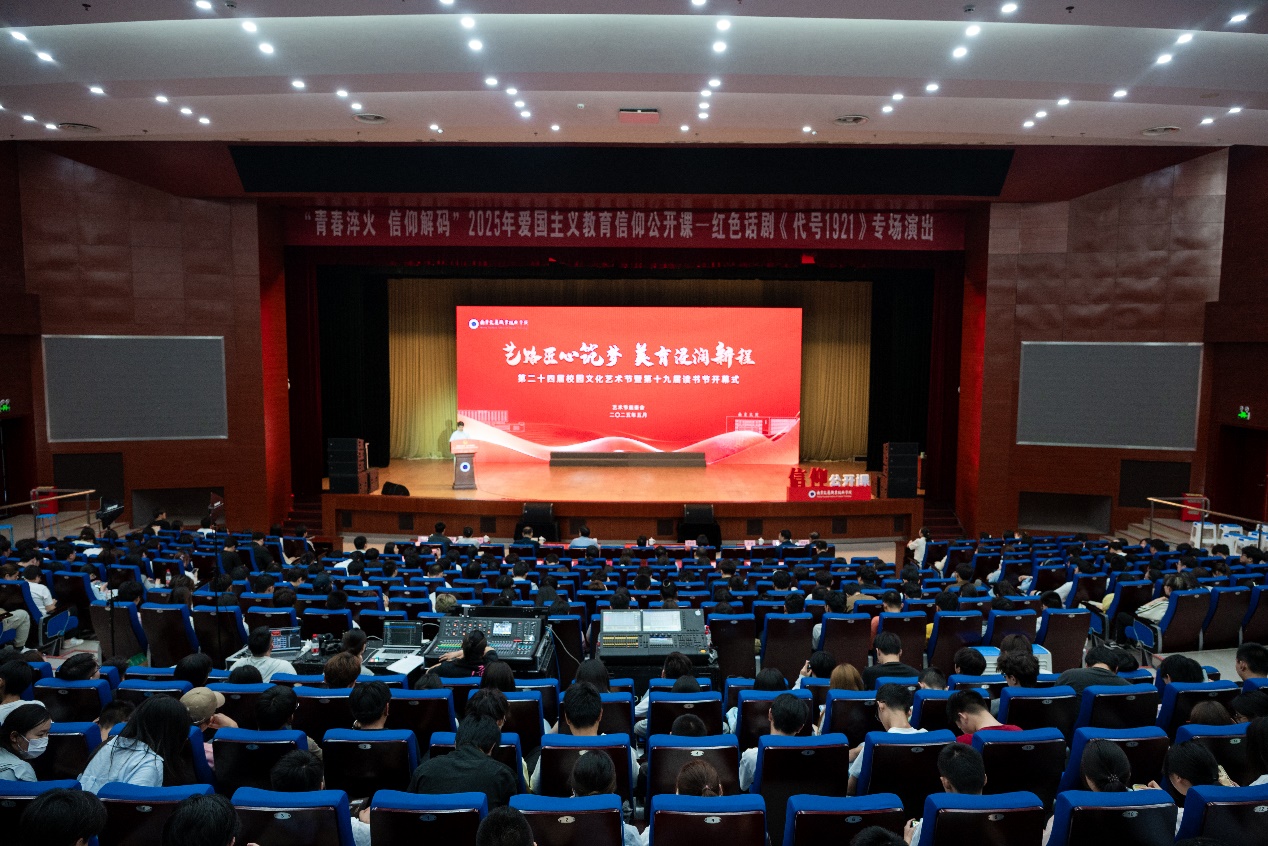 在開幕式上,開展了“青春淬火 信仰解碼”2025年愛國主義教育信仰公開課,全體師生共同觀看了由南京雨花劇院帶來的浸沒式紅色話劇《代號(hào)1921》,表演再現(xiàn)了革命者用熱血書寫忠誠、用生命詮釋信仰的壯烈篇章。演員精湛的演繹與創(chuàng)新的舞臺(tái)設(shè)計(jì),讓在場的師生跨越時(shí)空與歷史對(duì)話,在震撼與共鳴中接受了一次生動(dòng)的愛國主義教育。