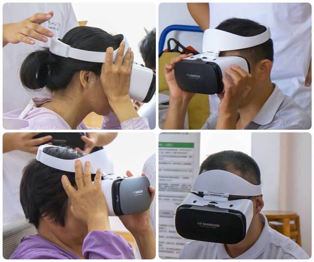 為打破空間阻隔帶來的心靈封閉,實(shí)踐團(tuán)創(chuàng)新開展“虛實(shí)煥心之旅”。借助VR技術(shù),實(shí)踐成員們?yōu)闅堈吓笥汛蛟炝顺两教摂M世界:黃山云海在眼前翻涌,故宮朱墻在光影中流轉(zhuǎn),熱鬧的市集聲在耳畔回響。當(dāng)一位腦部損傷的大哥戴上設(shè)備后,一直反復(fù)說著“好!”這場(chǎng)“見山見水見世界”的體驗(yàn),雖只是一次短暫的心靈觸碰,卻在虛擬與現(xiàn)實(shí)的交織中,為他們對(duì)外部世界的探索渴望增添了一份回應(yīng)。