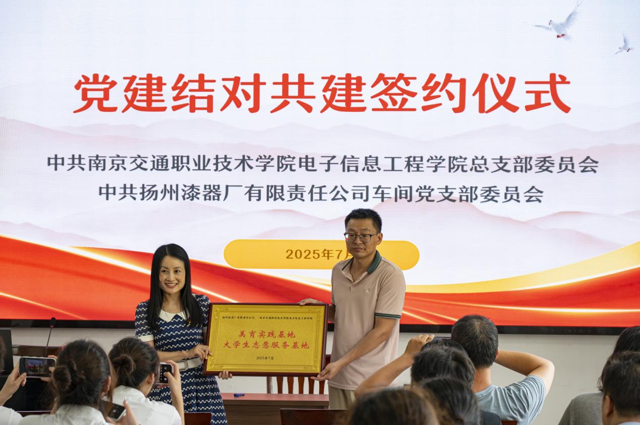 為深化校企協(xié)同,探索優(yōu)勢互補的發(fā)展機制,推動非遺文化傳承與企業(yè)服務融合,7月7日上午,南京交通職業(yè)技術學院電子信息工程學院與揚州漆器廠舉行黨建共建簽約暨“美育實踐基地”掛牌儀式。揚州漆器廠車間黨支部書記韓鋒、學院黨總支副書記吳蓉蓉、輔導員葛漢卿、企業(yè)黨員代表以及“數(shù)智童傳,漆藝新生——以青春科技助力非遺傳承實踐團”全體成員出席活動。