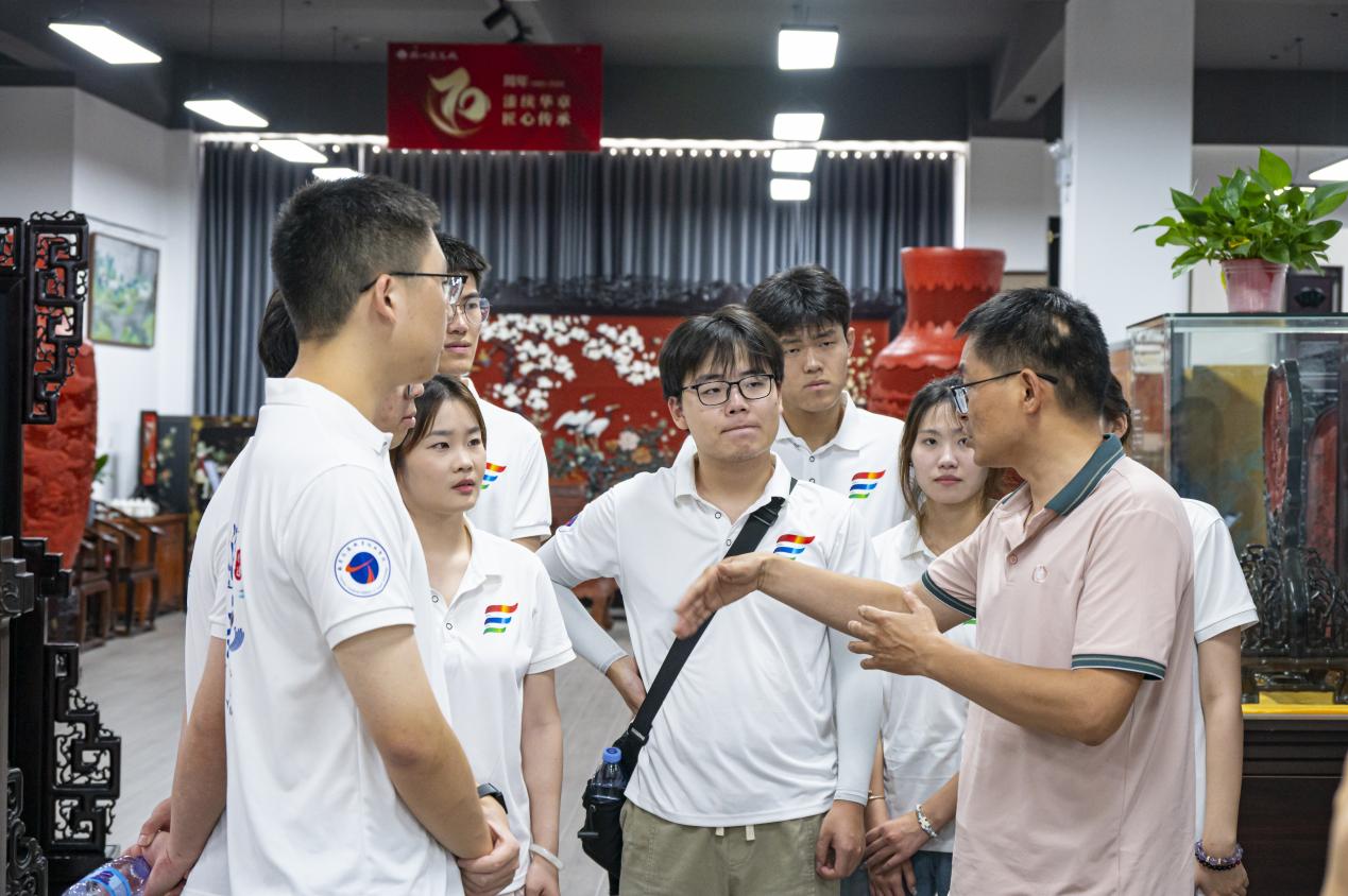 隨后,師生一行來到漆器廠藏品展示區(qū),深入了解揚州漆器的藝術魅力與發(fā)展脈絡。展廳中陳列著不同時期的漆器精品,從古樸典雅的傳統(tǒng)器物到融合現(xiàn)代設計的創(chuàng)新作品,生動展現(xiàn)了揚州漆器的技藝演進與文化積淀。黨員工匠結合實物為同學們講述展品背后的歷史背景與工藝特色,加深了大家對傳統(tǒng)文化的理解與敬意。