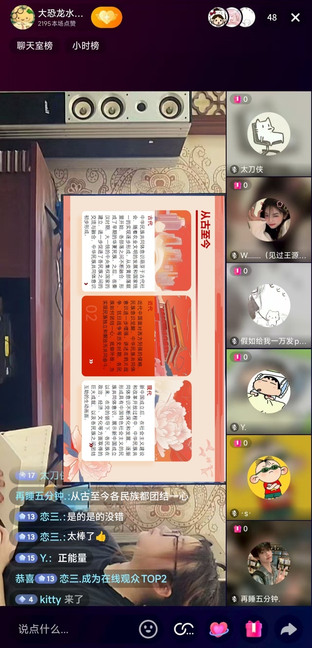 有的成員將課堂知識(shí)與社會(huì)見聞制作成短視頻,發(fā)布到各大交流平臺(tái),被大量轉(zhuǎn)發(fā)與收藏;有的成員挖掘身邊民族團(tuán)結(jié)故事在直播平臺(tái)宣講,獲社會(huì)共鳴與點(diǎn)贊評(píng)論;有的成員走進(jìn)社區(qū)少數(shù)民族同胞家中,暖心交流日常生活起居,熱心幫助生活困擾難題,與其建立了深厚的友誼;有的成員深入學(xué)校、社區(qū)開展宣講,凝聚民族團(tuán)結(jié)共識(shí)、激發(fā)奮進(jìn)力量;有的成員精心制作團(tuán)課,為學(xué)校入黨、入團(tuán)積極分子帶去社會(huì)實(shí)踐視角的思想之旅。