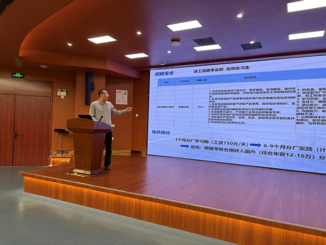 道路機(jī)械事業(yè)部李部長則聚焦本次招聘的具體需求,系統(tǒng)介紹了招聘崗位的工作職責(zé)、任職要求、薪酬福利體系、職業(yè)發(fā)展通道以及完善的培養(yǎng)模式。在互動環(huán)節(jié),同學(xué)們就工作地點(diǎn)、晉升機(jī)制、面試流程等關(guān)切問題踴躍提問,李部長一一給予了細(xì)致耐心的解答,現(xiàn)場氣氛熱烈融洽。