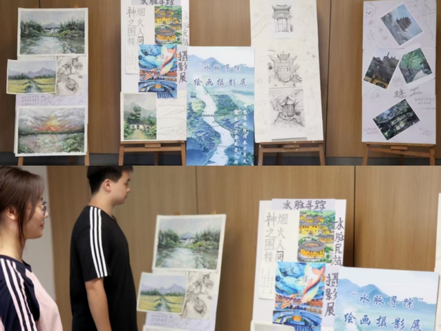 會后,全體人員前往廣宇樓一樓大廳參觀“赤籽心”實(shí)踐團(tuán)“水脈尋蹤”繪畫攝影展。展覽以“看悠悠運(yùn)河傳承千年文脈,在長江水岸感受人間煙火” 為核心,通過繪畫與攝影作品定格實(shí)踐中的文化瞬間與生活圖景,集中呈現(xiàn)學(xué)員實(shí)踐碩果。